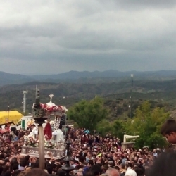 Al término de la misa, y tras guardar un minuto de silencio por las personas fallecidas en Nepal, las 64 cofradías filiales que han asistido a la romería este año, han ido tomando posiciones en orden inverso de antigüedad para acompañar a la "Morenita", como popularmente se la conoce, que ha recorrido las calzadas del cerro.