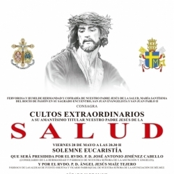 El sábado 29 de mayo, en horario de mañana, de 11:30h a 13:30h y por la tarde de 18:00h a 20:00h. estará expuesta en acto reverencial la imagen de Ntro. P. Jesús de la Salud. A las 20:30h será la función principal que presidirá el párroco de San Francisco y San Rodrigo, Mario González González.