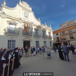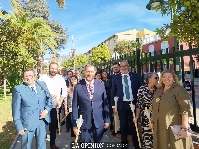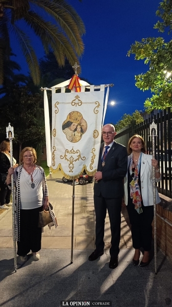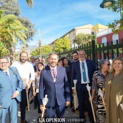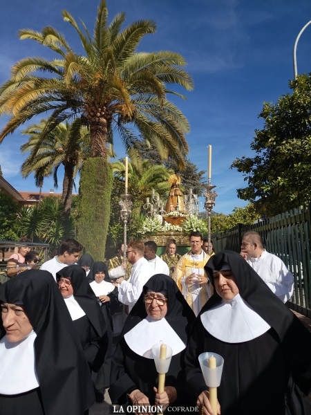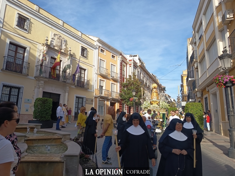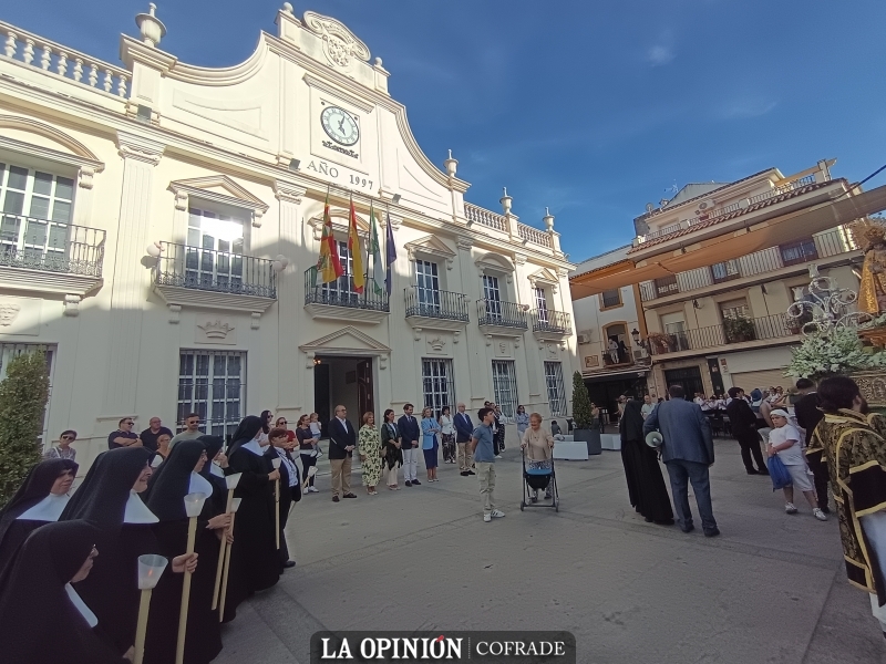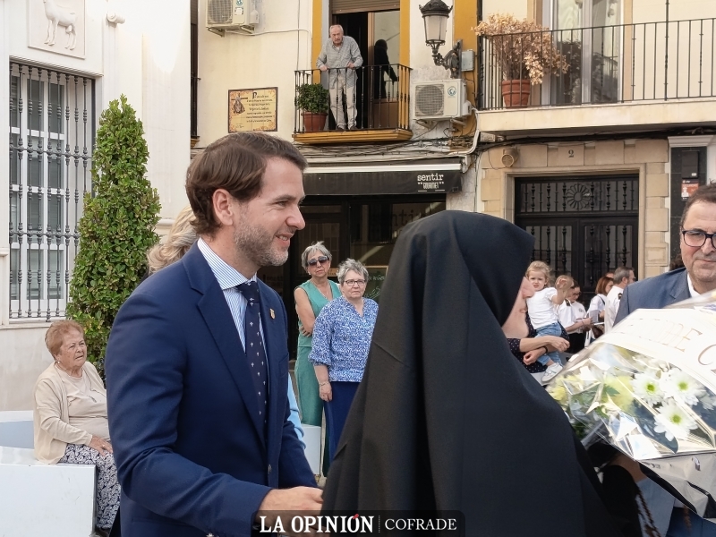 Durante el recorrido se rezaron los Misterios Gozosos del Santo Rosario, a cargo de Sor Olga, y se hicieron dos paradas significativas. Una en la Plaza de España, frente al Ayuntamiento, donde el alcalde de la Ciudad, Fernando Priego, acompañado de varios tenientes de alcalde y concejalas del gobierno municipal, ofrecía un ramo de flores a la imagen y agradeció a las Hermanitas su labor felicitándolas nuevamente en esta celebración.
