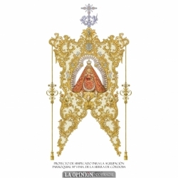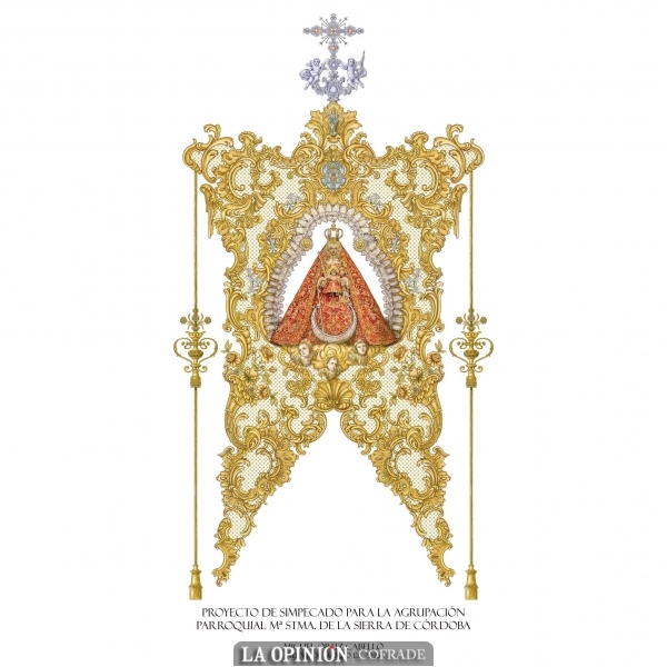El futuro Simpecado de la filial cordobesa tiene como motivo central una imagen de María Santísima de la Sierra sobre un fondo de malla con detalles bordados en oro y rematado por una cruz trinitaria en orfebrería y piedras preciosas.