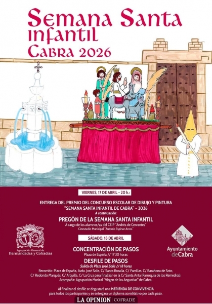 El programa se completa con la celebración este viernes 17 de abril del pregón de la Semana Santa Infantil, que este año correrá a cargo del alumnado del CEIP "Andrés de Cervantes", en el Cinestudio Municipal "Antonio Espinar Arcos". Y con la entrega de los premios del concurso de dibujo, que igualmente ha contado con una amplísima participación de todos los centros educativos de la localidad.