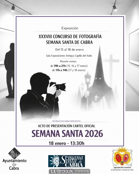 Asimismo, el domingo 18 de enero, a las 13:30 horas, en el mismo espacio expositivo, tendrá lugar el acto de presentación del Cartel Oficial de la Semana Santa de Cabra 2026, y la entrega de premios del XXXVIII Concurso de Fotografías, acto que pondrá broche final a esta exposición.