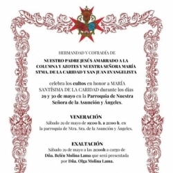 Los días 29 y 30 de mayo se celebrarán los cultos en honor a María Santísima de la Caridad, cotitular de la Hermandad de la Columna, en la parroquia de Ntra. Sra. de la Asunción y Ángeles.