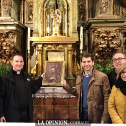 El Alcalde de Cabra, Fernando Priego Chacón, junto a varios concejales de la corporación municipal, han presentado la restauración del óleo de la puerta del Sagrario de la Iglesia de San Juan de Dios.