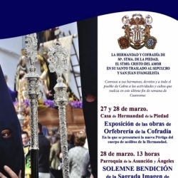 La hermandad de la Piedad termina la Cuaresma con una muestra de obras de orfebrería de la Cofradía, que podrá visitarse el viernes 27 y sábado 28 de marzo en su casa hermandad. El sábado, se presentará la nueva pértiga del cuerpo de acólitos de la Hermandad. Y también en la parroquia de la Asunción y delante del paso procesional, este mismo día 28 a las 13 horas, se bendice la nueva imagen del misterio del Traslado al Sepulcro.