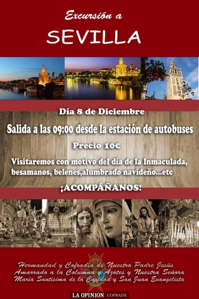 La Hermandad de la Columna organiza un viaje a Sevilla el próximo lunes 8 de diciembre, para visitar los distintos besamanos que en dicha jornada se organizan en la capital de Andalucía, con motivo de la festividad de la Inmaculada Concepción. Así, podrán contemplarse en besamanos a varias imágenes como la Virgen del Rocío de la Hermandad del Beso de Judas, Ntra. Sra. del Socorro de El Amor, Santa Cruz, Pura y Limpia o la Divina Pastora de la Primitiva Hermandad de Santa Marina, entre muchas otras.