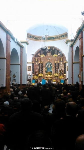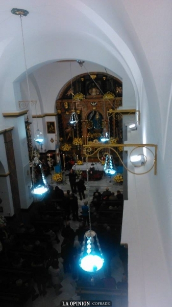 En torno a las 11 de la mañana, y presidiendo la comotivia el banderín azul que posee la tradicional Romería del 8 de diciembre, llegaban los romeros al Santuario, donde ya esperaban varias decenas más de devotos que habían llegado hasta el lugar en autobuses y vehículos particulares. A las 12 de la mañana comenzaba la Solemne Eucaristía del día de la Purísima, presidida por el Rvdo. José Juan Jiménez Güeto, quien en su homilía entusiasmó a todos los presentes y finalizó la misma dando las gracias al pueblo de Cabra y en especial a los hermanos de la Real Archicofradía por la decisión de que la devoción más antigua de la provincia acuda a Córdoba a la procesión magna "Regina Mater", ya que la Celestial Viajera se alojará en la Parroquia de la Trinidad, sede del Sacerdote egabrense.