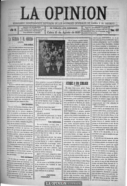 |  | 100 años de una importante obra popular en el Santuario de la Virgen de la Sierra 14.08.20 - Escrito por: Antonio Ramón Jiménez Montes   Hace 100 años La Opinión publicaba, entre otras informaciones, noticias y colaboraciones, unas columnas de la sección Santuario de la Sierra, en las que se hablaba de unas obras que se estaban llevando a cabo.