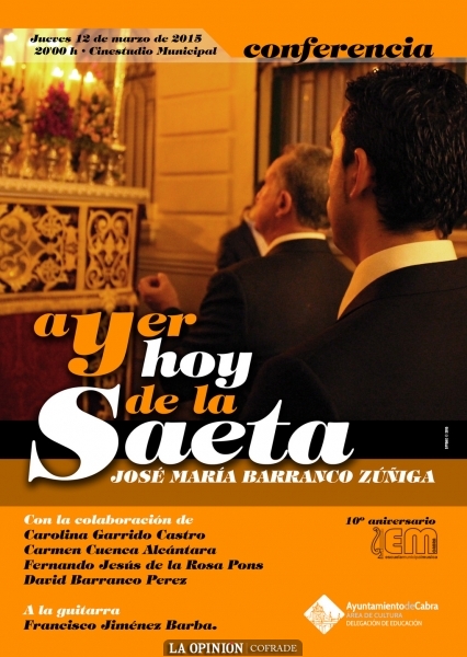 El jueves 12 de marzo, la delegación de Educación del Ayuntamiento de Cabra, ha organizado un acto que tendrá lugar en el Cinestudio Municipal, con motivo del décimo aniversario de la Escuela Municipal de Música y Danza. Está dedicado a la Saeta y tendrá una parte musical junto a la conferencia que ofrecerá el saetero José María Barranco Zúñiga.