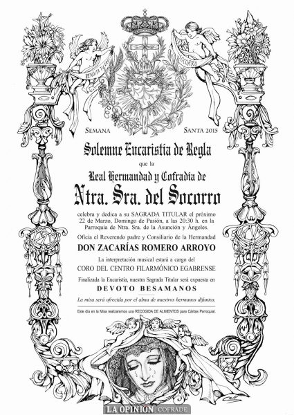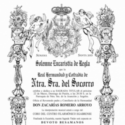 El domingo 22, el domingo del pregón, a las ocho y media de la tarde, serán los cultos a la Virgen del Socorro en la Asunción y Ángeles, en los que todo aquel que asista puede llevar 1kg de comida no perecedera para Cáritas. Y ya hemos comentado el besapié al Cristo Yacente de las Angustias, al del Sepulcro y posterior traslado.