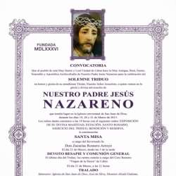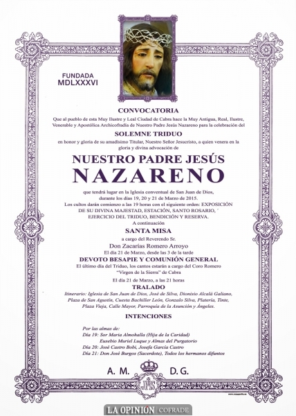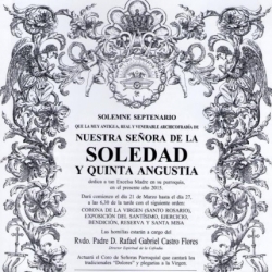 Pero hasta ese 22 de marzo, tenemos una semana con otras opciones para continuar viviendo este tiempo de Cuaresma. El triduo al Nazareno será en San Juan de Dios comenzando el día de San José, 19 de marzo para terminar el sábado 21, cada tarde a partir de las siete. El sábado 21 a partir de las tres de la tarde, Ntro. Padre Jesús Nazareno será expuesto en besapié y tras la misa, trasladado a la Asunción. Y también esa tarde del sábado, comienza el Septenario a la Soledad.