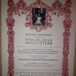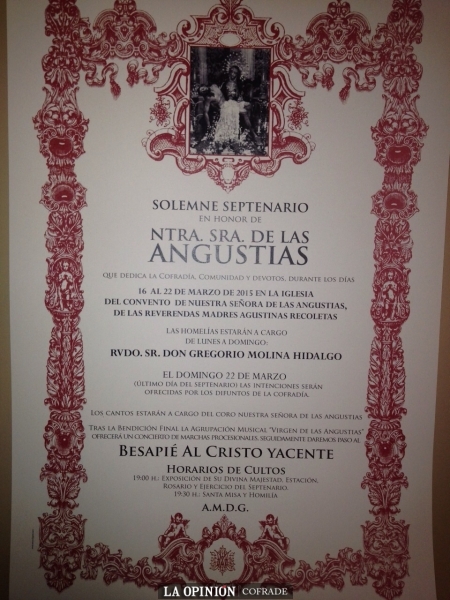 La celebración de estos cultos de la antigua Cofradía Servita de Cabra será entre los días 16 al 22 de marzo, a partir de las siete de cada tarde, siendo la misa a las y media, con homilías a cargo del sacerdote Gregorio Molina Hidalgo. El septenario de las Angustias culminará el Domingo de Pasión, 22 de marzo, con el besapié al Cristo Yacente, en una jornada que también vendrá marcada por el Pregón de la Semana Santa, a cargo de Manuel Fernández y luego por la tarde con el tradicional traslado del Sepulcro desde San Juan de Dios a la Asunción.