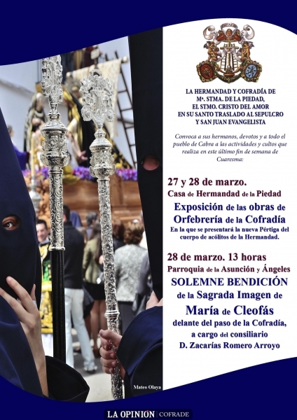 La bendición de la imagen de María de Cleofás, tendrá lugar delante del paso procesional y estará a cargo del consiliario Zacarías Romero Arroyo. La imagen está realizada a tamaño natural de candelero y articulada en los brazos, tallada en madera de cedro y policromada al óleo, por el imaginero sevillano Fernando Aguado, autor del resto de obras del misterio del Traslado al Sepulcro de Cabra, de la hermandad de la Piedad.
