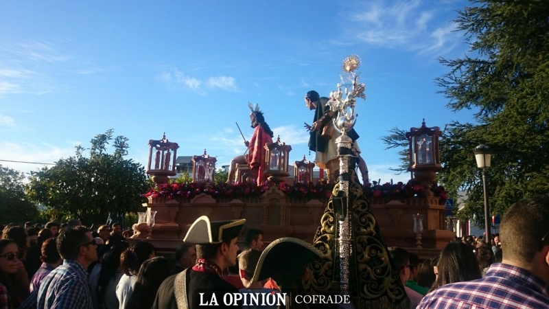 La Barriada de Ntra. Sra. de la Sierra despidió con una tarde espléndida el paso del Cristo de la Sentencia, llevado por sus costaleras y con la novedad de un nuevo trono que pudo verse en fase de carpintería, con el diseño de Miguel Ortiz y Manuel Jurado. También los romanos que acompañan en la escena de la Coronación de espinas, ofrecieron como novedad las vestimentas que suelen tener durante todo el año en el Museo de la Pasión, inspiradas en los ropajes de soldados romanos del siglo I. La Virgen de la Paz, lució nuevamente en su magnífico paso de palio, ofreciendo un arreglo floral al que nos tiene acostumbrados su capataz, llegando entre mucha gente hasta la parroquia de la Asunción, donde quedaron ambos pasos. Buenas marchas para un discurrir cadencioso en el más largo de los itinerarios cofrades de nuestra ciudad que unió así la barriada más nueva con uno de los barrios históricos y dando muestras del buen hacer de esta hermandad y sus componentes, la primera que tuvo dos pasos desde su creación en los años 70 del siglo XX surgiendo casi al tiempo que se construyó el templo parroquial de San Francisco de Paula y San Rodrigo.
