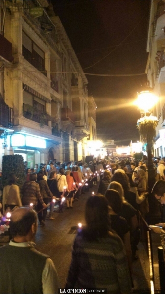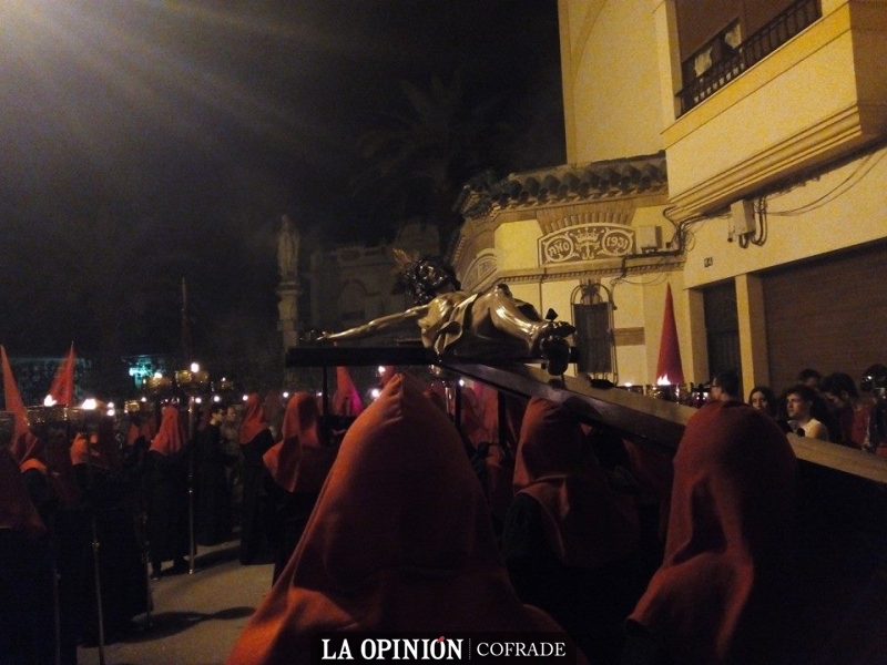 Y la madrugada de este Jueves Santo volvió a congregar muchas personas ante las puertas del Colegio Niño Jesús de la Fundación Termens, donde las Hijas de la Caridad mantienen el legado de la Vizcondesa de Termens entre el que se encuentra el culto a la imagen del Cristo de la Expiración que salió en procesión a la una de la madrugada. Antorchas y velas prestaron su tenue luz a los capuchones rojos y negros que rezaron el Via Crucis dirigido por el consiliario, Rafael Castro, párroco de los Remedios, finalizando en cada estación con el cántico del "Ten Piedad, Dios Mío" que entonan a coro todos los hermanos que participan en esta procesión, primera de las que tienen lugar de madrugada en los días que quedan de la Semana Santa 2015.