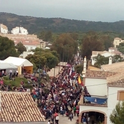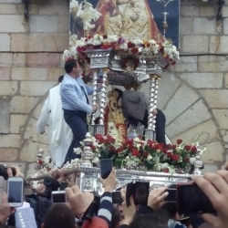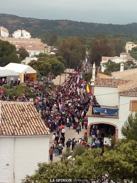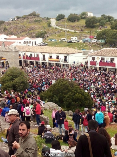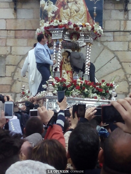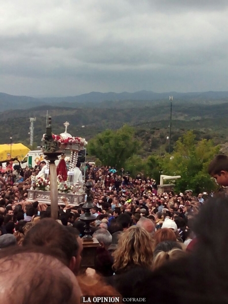 Al término de la misa, y tras guardar un minuto de silencio por las personas fallecidas en Nepal, las 64 cofradías filiales que han asistido a la romería este año, han ido tomando posiciones en orden inverso de antigüedad para acompañar a la "Morenita", como popularmente se la conoce, que ha recorrido las calzadas del cerro.