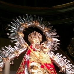 Dos trinitarios, subidos en las andas custodiando la imagen, han ido tomando objetos para ser pasados por el manto, al igual que los niños que son elevados hasta las andas para ser bendecidos por la Virgen.