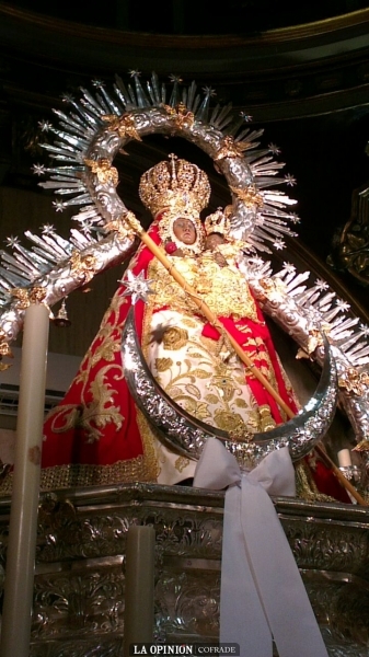La imagen iba ataviada con un manto de terciopelo rojo y bordado en oro fino en estilo barroco con elementos vegetales y flores salpicadas, donado en 1961, y una saya recientemente restaurada bordada en oro fino.