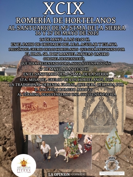 El pregón de la XCIX Romería de Hortelanos será el sábado 16 de mayo, a las nueve de la noche en el patio de cristales del Instituto-Fundación Aguilar y Eslava de Cabra, siendo pronunciado por el Coronel de Infantería Manuel Naveas Castro, a quien presentará Nicolás Luna Roldán.