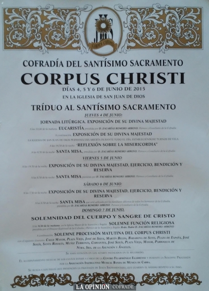 La Cofradía del Santísimo, ha organizado una serie de actividades de cara a la celebración de la Solemnidad del Corpus Christi que tiene lugar el domingo 7 de junio próximo. Entre los días 4 al 6 se celebrará un triduo en San Juan de Dios y el domingo será la función principal y posterior procesión matutina con el Cuerpo de Cristo en la magnífica custodia de Sánchez de Luque y Damián de Castro (s. XVII y XVIII) que se conserva en la parroquia de la Asunción y Ángeles de nuestra ciudad.