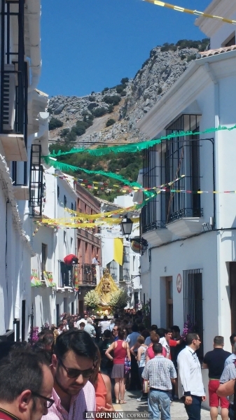 Camino de Zuheros, con un retraso en el horario previsto pero con la ilusión de llegar a uno de los municipios que más de cerca vive la devoción serrana, la Virgen y su comitiva era esperada por toda la población con la alcaldesa de Zuheros, el Juez de Paz, el párroco y las cofradías, y todo el pueblo, que se ha volcado decorando las calles y colgando banderas, colgaduras, cuadros, y flores, así como una alfombra que llegaba hasta el final de la calle Llana para llegar a la parroquia de los Remedios, junto al Castillo, en cuya torre ondeaban dos banderas de la Virgen de la Sierra, que han anunciado esta histórica visita.