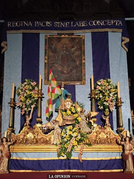 En el recorrido se habían instalado altares, colgaduras y adornos para el paso de la Patrona de Cabra, mientras las personas se iban sumando a la procesión que la llevó hasta la parroquia de la Asunción de Priego de Córdoba. Con un repique general de campanas y el revoleo de la Bandera, la Virgen de la Sierra entraba en el templo que estaba repleto de fieles. Un simbólico altar, a modo de los retablos que son tan populares en Priego de Córdoba en los Domingos de Mayo, montado por las cofradías de la parroquia de la Asunción, recibía y servía de fondo a las andas con la Virgen de la Sierra. Presidiendo este retablo un espléndido lienzo del siglo XVIII que se conserva en la sacristía de la iglesia mayor de Priego, alusivo a la Virgen de la Sierra y bajo él un arcángel con la bandera y el tambor, escoltado por otros ángeles mancebos, sobre tela azul alusiva a la Reina de la Paz y a la Purísima Concepción.