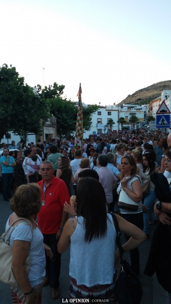 Tras la celebración de la misa y la entrega de los recuerdos de rigor, la Virgen de la Sierra volvía a Cabra donde la esperaban muchas personas en las puertas de las Agustinas Recoletas, que la iban a acoger en la noche del 20 al 21 de junio. La espera se hizo larga pero todos los congregados querían ver a su Patrona llegar en esta histórica y sorprendente visita a nuestros queridos pueblos vecinos, pues las muestras de devoción desbordaron todo lo imaginado previamente. Las cofradías del monasterio, Pollinita, Angustias y Perdón, esperaban con sus estandartes y representantes en las puertas del antiguo cenobio de las Religiosas Agustinas de Cabra, con un ramo de rosas blancas para ofrendar a la imagen de la Virgen.