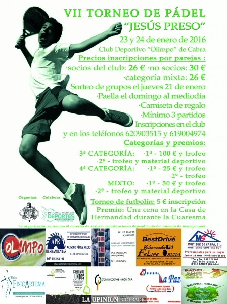 Durante el próximo fin de semana se celebrará el VII Torneo de Padel Jesús Preso, el mismo se desarrollará durante los días 23 y 24 de enero en las instalaciones del Club Olimpo de nuestra ciudad.