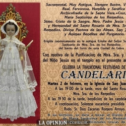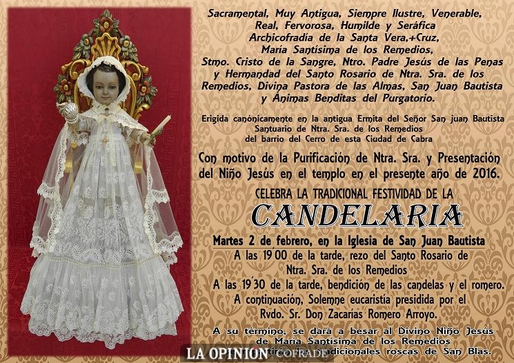 La Archicofradía de la Santa Vera Cruz con motivo de la Purificación de Nuestra Señora y Presentación del Niño Jesús en el Templo celebrará la tradicional Festividad de la Candelaria, será el martes 2 de Febrero, en la Iglesia de San Juan Bautista, dando comienzo a las 19:00h. con el Rezo del Santo Rosario.