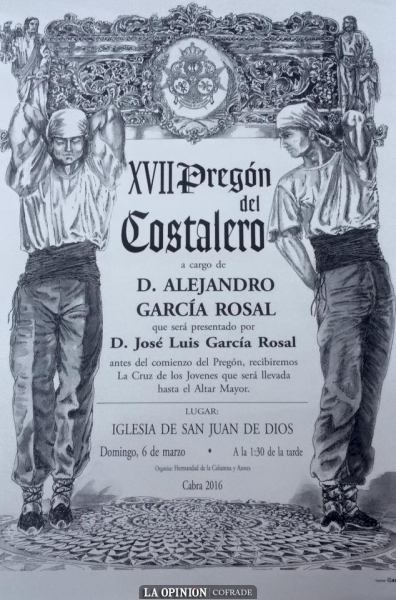 La hermandad de la Columna ha designado a Alejandro como pregonero en esta decimoséptima edición del Pregón del Costalero y estamos seguros que ha sido un acierto. Aunque están siendo días complicados para él y su familia, estamos seguros que en estas vísperas de su pregón, que también está cerca del día de San Rodrigo, aquellas devociones que impregnan su día a día harán lo que tengan que hacer para que el domingo, Alejandro, a quién va a presentar su hermano José Luis, nos ofrezca su emoción y sentimiento en torno al mundo de los costaleros y costaleras. Algunas notas musicales le acompañarán en este pregón cuyo encargo recibió con cariño y al que ha dedicado toda su ilusión.