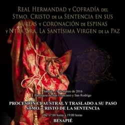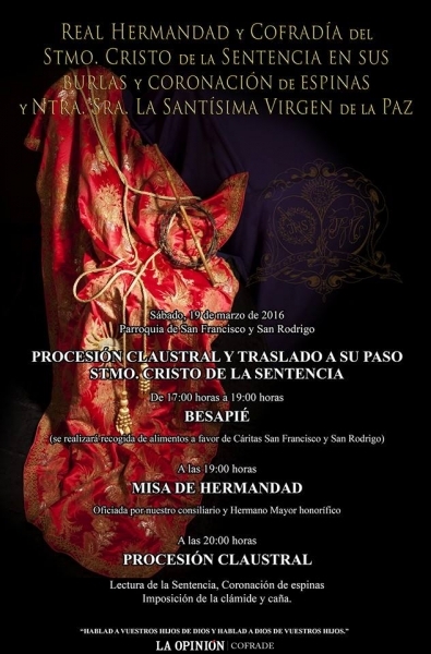 Ya el sábado víspera de Ramos, en la parroquia de San Francisco y San Rodrigo, la cofradía de la Sentencia y la Paz tendrá besapiés hasta las siete, que dará paso a la misa en honor del Cristo de la Sentencia, con procesión claustral, lectura de la Sentencia, coronación de espinas e imposición de clámide y caña.