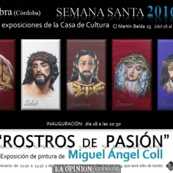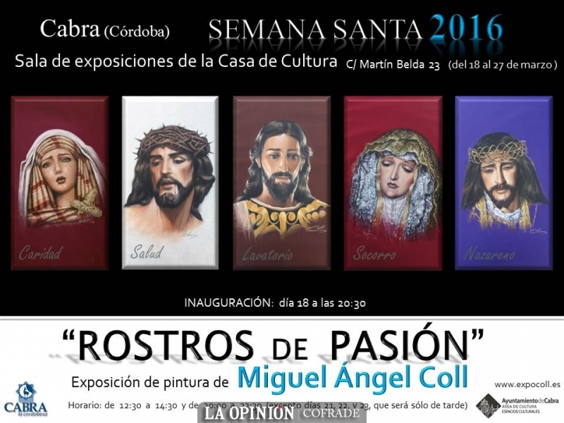 El viernes 18, a las 20:30h se inaugura también una exposición que, bajo el título Rostros de Pasión, recoge 35 pinturas de Miguel Ángel Coll Mora, reflejando las imágenes de la Semana Santa de Cabra. Será en la sala de exposiciones de la Casa de la Cultura. Estará abierta toda la Semana Santa en horario de tarde, de 20:00h a 22:30h. y los sábados, domingos y festivos también por la mañana, de 12:30h a 14:30h.