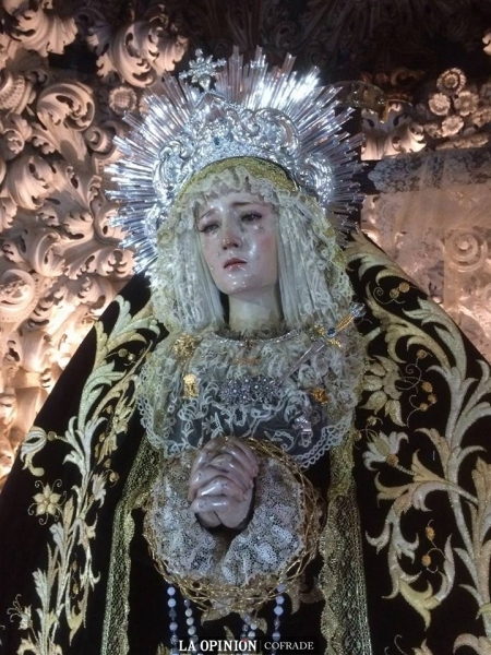 En la iglesia de San Juan de Dios, el Viernes de Dolores será también la misa en honor de la titular de la cofradía que cierra el Viernes Santo a su titular, en la que será bendecido el manto restaurado que ha estado expuesto en el Museo Aguilar y Eslava desde su presentación.
