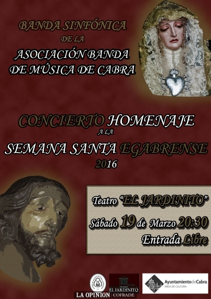 La Banda de Música de Cabra ofrecerá en el Teatro El Jardinito el sábado 19, a las ocho y media de la tarde, su tradicional concierto homenaje a la Semana Santa de Cabra con entrada libre y bajo la batuta de Antonio Moral Jurado. Para no perdérselo.