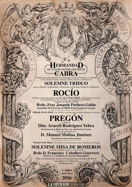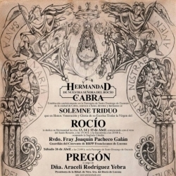 El sábado 16 de abril, también en el mismo templo en el que está erigida la filial del Rocío de Cabra y a las nueve de la noche, tendrá lugar el pregón anunciador de la Romería de Pentecostés 2016, que este año estará a cargo de la presidenta de la hermandad del Rocío de Lucena, Araceli Rodríguez Yebra, a quien presentará el secretario de la de Cabra, Manuel Molina Jiménez.