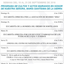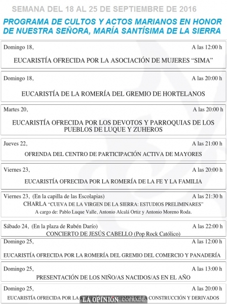 Esta semana las actividades que ha hecho públicas la Real Archicofradía son organizadas por distintos colectivos, entre los que se encuentra las celebraciones que dedican los devotos de Zuheros y Luque, los gremios de Hortelanos, Comercio y Panadería, Construcción y derivados, la romería de la Fe y la Familia, el centro de mayores o la asociación de mujeres SIMA. Además hay previsto un concierto de rock católico y una charla sobre los estudios preliminares de la cueva de la Virgen de la Sierra.