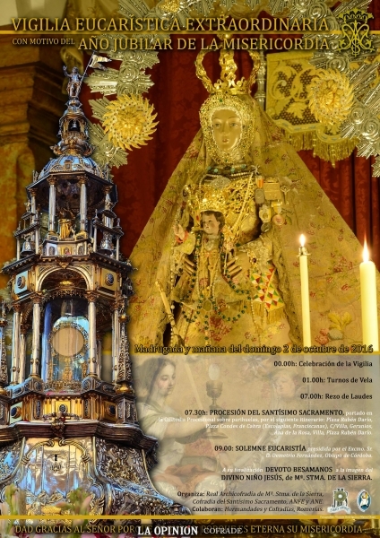 El penúltimo fin de semana de estancia en Cabra de nuestra Patrona, tendrá lugar una vigilia extraordinaria con adoración al Santísimo Sacramento que terminará con procesión al amanecer. Según señalaban miembros de la archicofradía, ese día se quitarán las andas de procesión y se instalará un altar extraordinario donde se venerará a la Virgen de la Sierra hasta volver a entronizarla en sus andas de viaje para la subida. En la vigilia y posterior procesión eucarística, se usará la custodia procesional del Corpus Christi.
