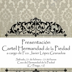 Por su parte la Cofradía de Ntra Sra de la Piedad, también el sábado pero a las nueve y media de la noche, presentará su cartel en su Casa de Hermandad (C/ Priego, 12), estando a cargo de Fco. Javier López Granados.