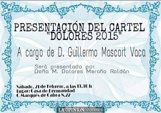 La presentación del Cartel DOLORES 2015, el sábado día 21 de Febrero a las 13:30 horas en su Casa de Hermandad ( C/ Marqués de Cabra nº 22), contará con la intervención de Guillermo Mascort Vaca, a quien presentará Mª Dolores Meroño Roldán.