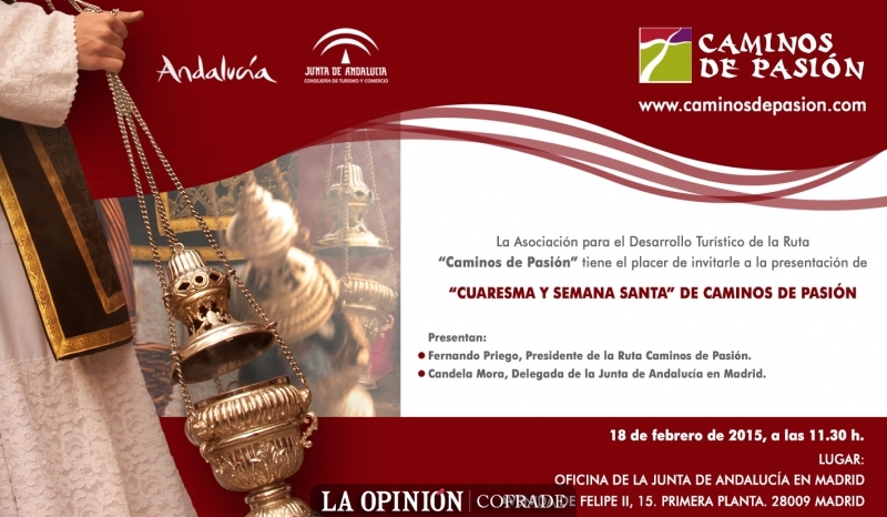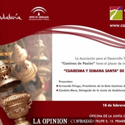 La delegada de la Junta de Andalucía en Madrid, Candela Mora González, y el presidente de Caminos de Pasión y alcalde de Cabra, Fernando Priego Chacón, presentan este miércoles 18 de febrero el nuevo producto y programa "Cuaresma y Semana Santa de Caminos de Pasión". El acto tendrá lugar a las 11:30 en la Oficina en Madrid de la Consejería de Presidencia de la Junta de Andalucía. Habrá una degustación de los dulces típicos de la zona en Cuaresma y Semana Santa.