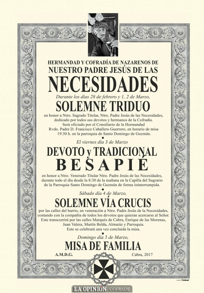 Y previamente a ese día de gran devoción en torno al conocido como Señor de las tres gracias - por la costumbre de pedirle tres favores-, su cofradía celebra triduo en la parroquia de Santo Domingo, sede de la hermandad, los días 28 de febrero, 1 y 2 de marzo, a las 19:30h.