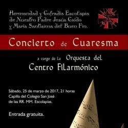 En lo musical el Centro Filarmónico Egabrense ofrece su concierto de cuaresma en la iglesia de las Escolapias, ante la cofradía del Buen Fin. Será el sábado 25 de marzo a las 21:00h. y colaboran el Ayuntamiento de Cabra - delegación de Cultura - y Caminos de Pasión. Y organizado por la cofradía del Calvario, la Banda Sinfónica de Ogíjares (Granada) ofrecerá un concierto en el Teatro El Jardinito el domingo 26 a las 12:00h. dentro de los actos del 430º aniversario fundacional de la cofradía del Calvario. Ambos conciertos tienen entrada libre.