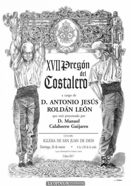 Entre ellos tendremos el pregón del costalero que organiza la cofradía de la Columna y Caridad en la iglesia de San Juan de Dios y que en esta décimo séptima edición estará a cargo de Antonio J. Roldán León, siendo presentado por Manuel Calahorro Guijarro. Será el domingo 26 de marzo a las 13:30h.