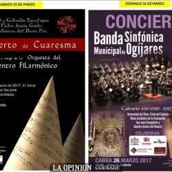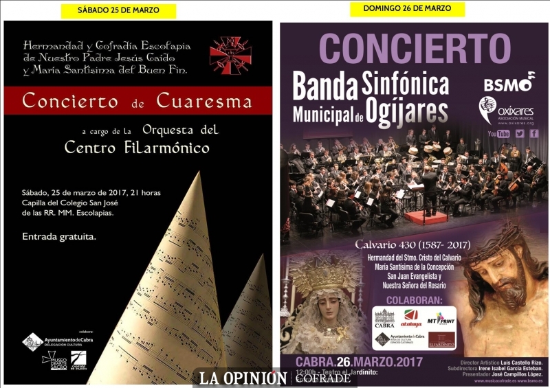 El Centro Filarmónico Egabrense ofrece su concierto de cuaresma en la iglesia de las Escolapias, ante la cofradía del Buen Fin. Será el sábado 25 de marzo a las 21:00h. y colaboran el Ayuntamiento de Cabra - delegación de Cultura - y Caminos de Pasión.