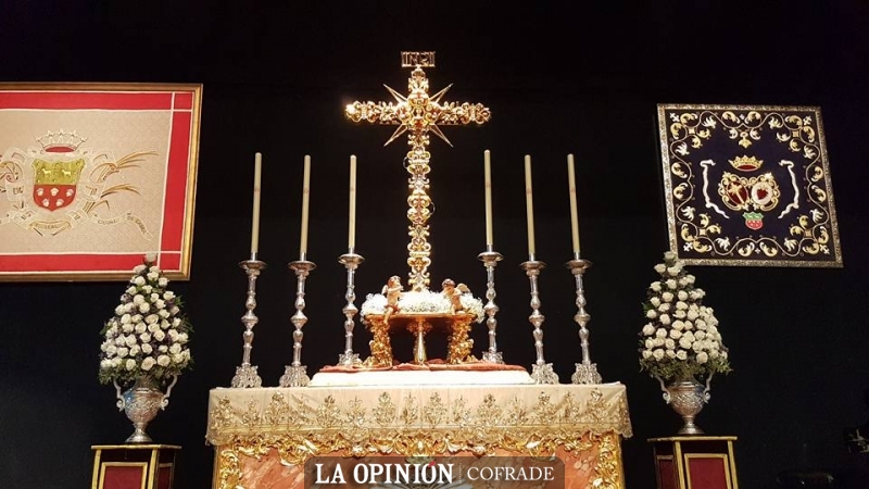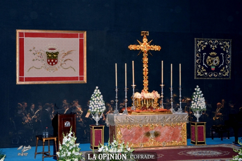 El escenario estaba presidido por cuatro elementos de las cofradías del pregonero: la cruz de guía del Huerto, la peana del Corpus, el altar de la Virgen de la Sierra y los candelabros del Silencio, junto a dos angelitos del paso del Huerto y las medallas de estas cofradías. A ambos lados sendos reposteros de la ciudad de Cabra y de la agrupación de cofradías. Un piano de cola y un gramófono completaban la escena junto al atril y tras un fino paño, la banda de música de Cabra que abrió el pregón con el tradicional pasacalle La Cruz parroquial de López Cordón. Sonaría también la marcha Aniversario de Pasión en Cabra, de Manuel Aguilar Aranda.