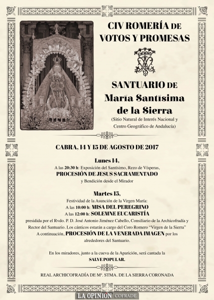 actos que tendrán lugar en el histórico Santuario de Ntra. Sra. María Santísima de la Sierra (sitio natural de interés nacional):