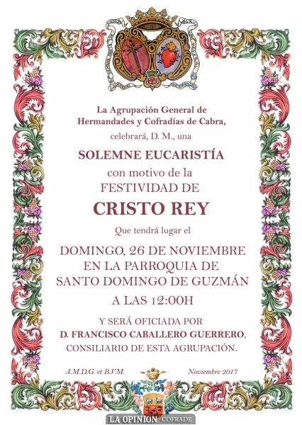 La Agrupación General de Hermandades y Cofradías de Cabra, celebra, el próximo domingo 26 de noviembre a las 12:00 horas del medio día, la Solemnidad de Cristo Rey. La Solemne Eucaristía tendrá lugar en la Parroquia de Santo Domingo de Guzmán, siendo presidida por el Rvdo. Sr. Don Francisco Caballero Guerrero, párroco del citado templo y consiliario del organismo cofrade.