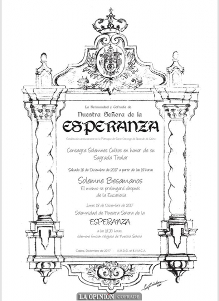 La fiesta de la Experanza es el 18 de diciembre si bien la hermandad ha organizado los cultos para el sábado 16, a partir de las seis de la tarde. La imagen de la Virgen de la Esperanza será expuesta en besamanos, siendo la celebración de la eucaristía a las 19:30h.
