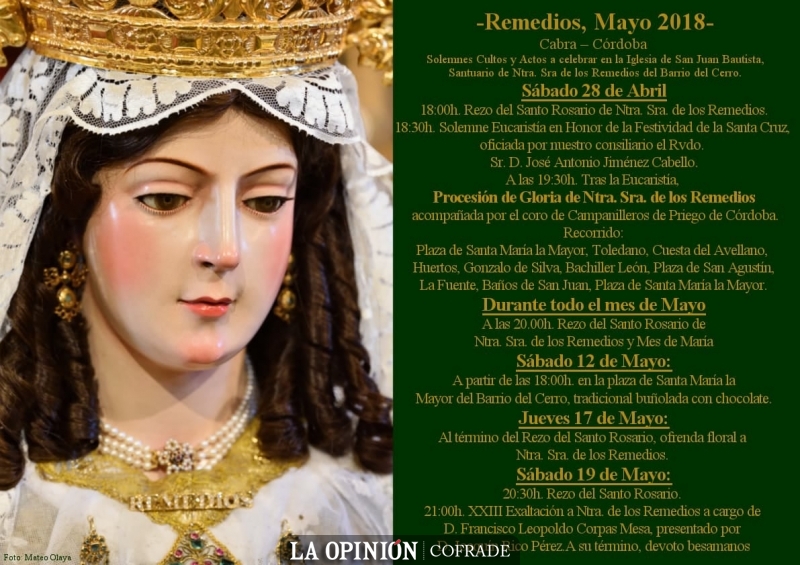 A las 20.00h. Rezo del Santo Rosario de Ntra. Sra. de los Remedios y Mes de María