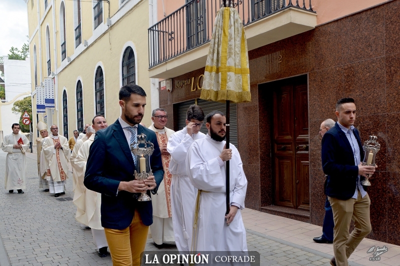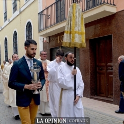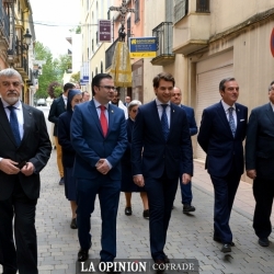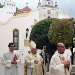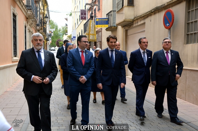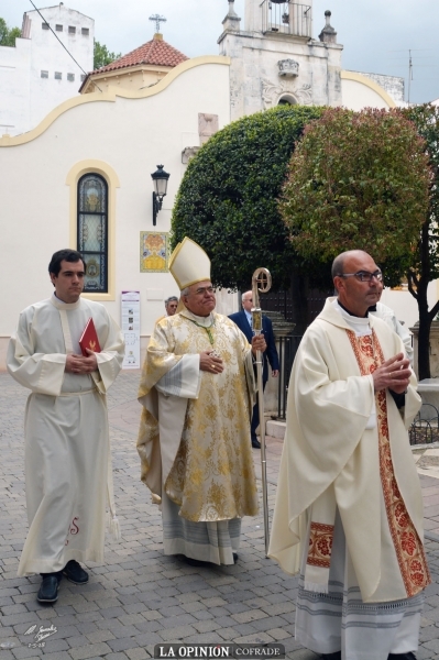 A las 12 de la mañana partía de la parroquia de los Remedios una sencilla procesión encabezada por los miembros de la Fundación Aguilar y Eslava -Salvador Guzmán, Francisco Ortiz, Fernando Priego, José L. Arrabal y Antonio R. Jiménez- a los que acompañaba el autor del Santo Cristo, Juan M. Miñarro así como Sor Emilia y Sor Pilar de la Comunidad Vicenciana de las Hijas de la Caridad de Cabra, que actuaron como madrinas de la bendición. Seguía la cruz parroquial con dos cirios portados por hermanos de la cofradía del Huerto, el seminarista egabrense Ángel Maiz Tejero y los acólitos Rául García y Joaquín Ruiz. A continuación iban los ministros concelebrantes, los cuatro párrocos de Cabra - Francisco Ramírez, Francisco Caballero, Rafael Castro y José Antonio Jiménez- el Vicario de la ciudad de Córdoba, Jesús Poyato y el maestro de ceremonias Fray Joaquín Pacheco OFM, guardián del convento franciscano de la vecina ciudad de Lucena y finalmente el señor obispo mons. Fernández González con mitra y báculo que presidió la celebración.